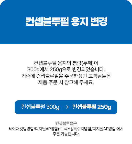 임시주문불가 용지안내원자재 수급 문제로 인해 주문이 불가한 용지를 안내해 드립니다. 고객 여러분의 많은 양해 부탁 드리며 주문 시 참고 바랍니다.