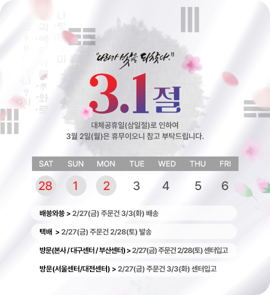 | 1,346 | 삼일절 휴무 택배 안내 | 2026.02.26 | |||||||||||||